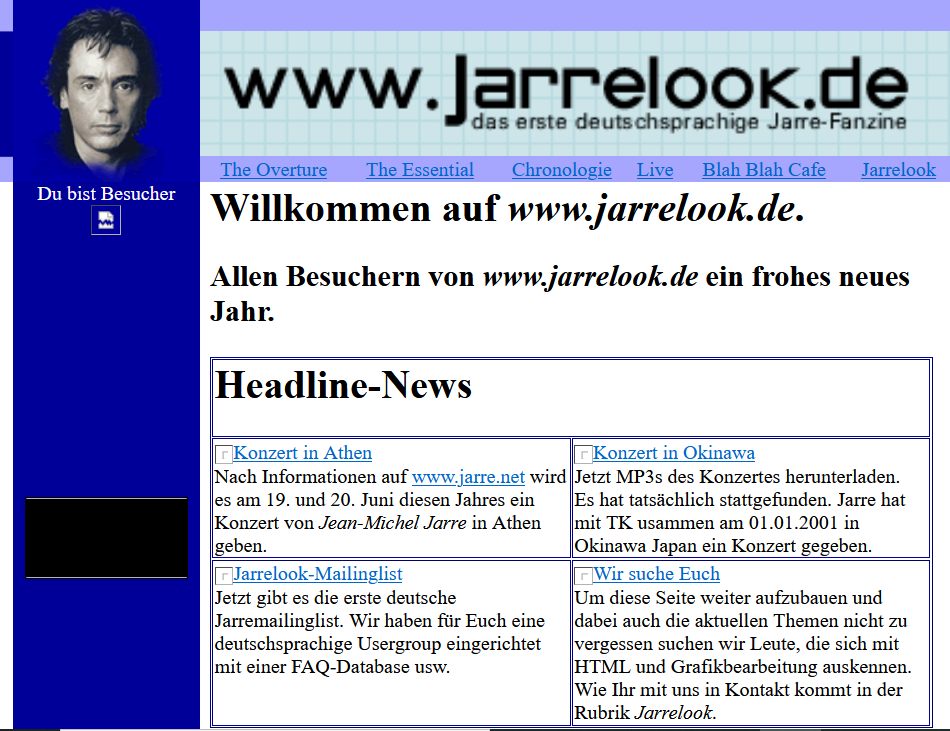 Auch in diesem Jahr gibt es wieder ein bisschen was zu feiern: Im Februar 2000 ging erstmals eine deutschsprachige Jean-Michel Jarre-Fanwebsite online: www.jarrelook.de.