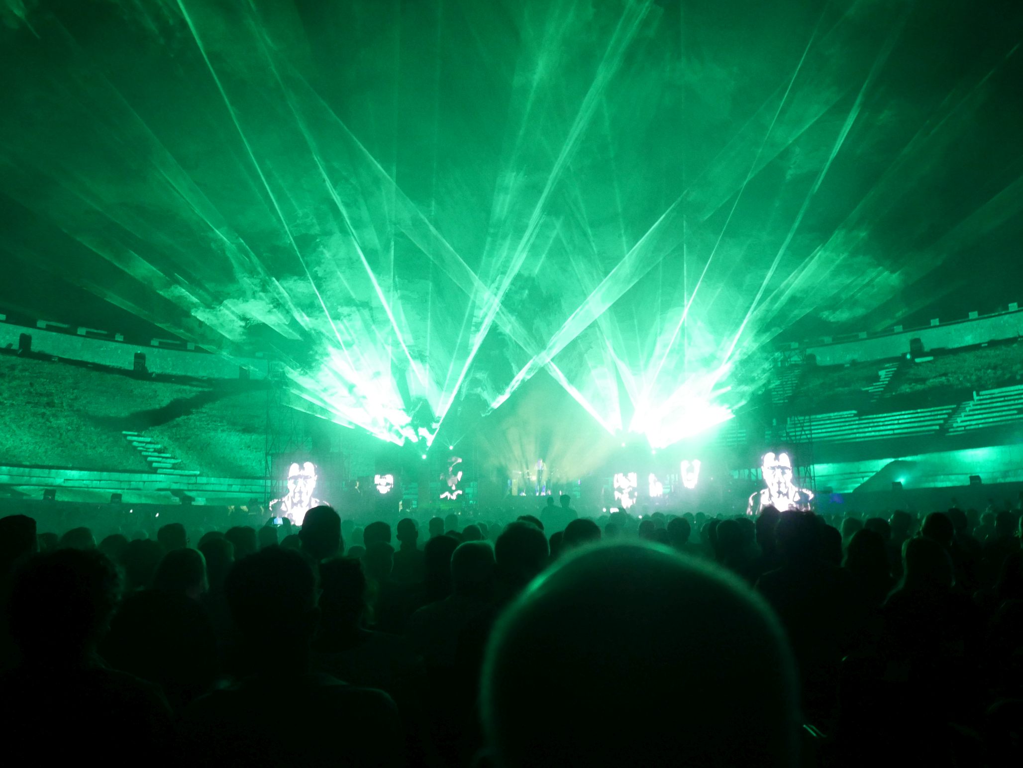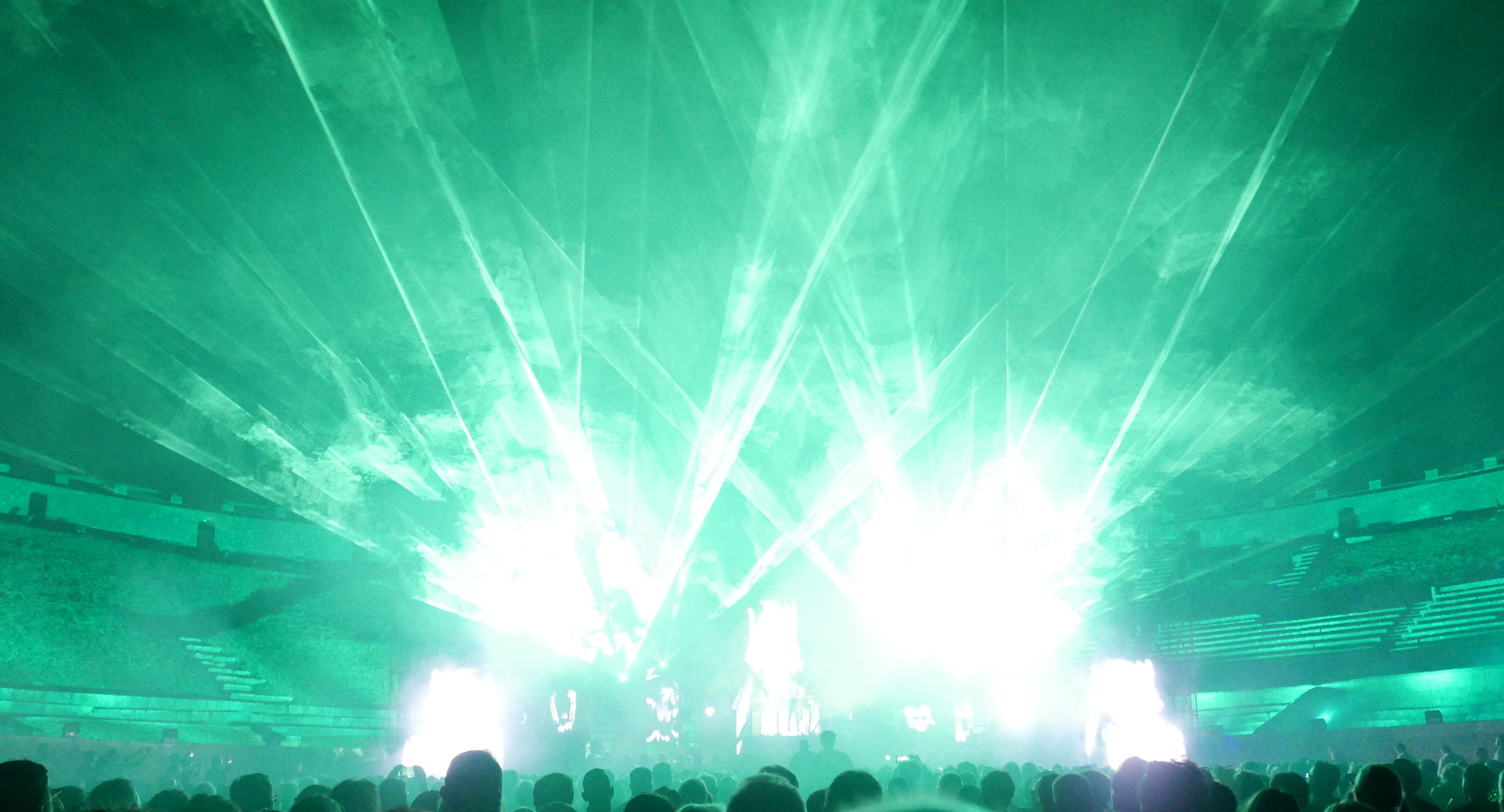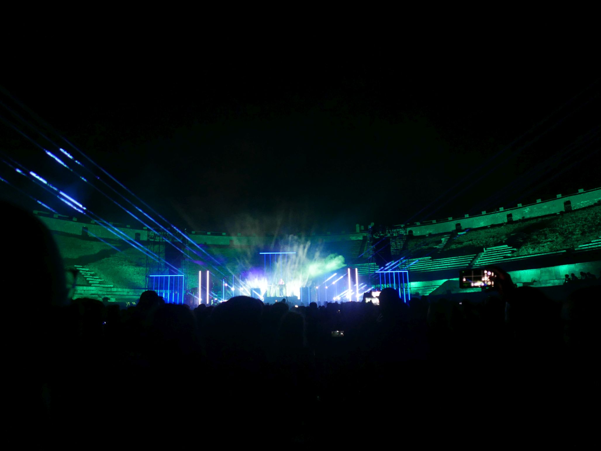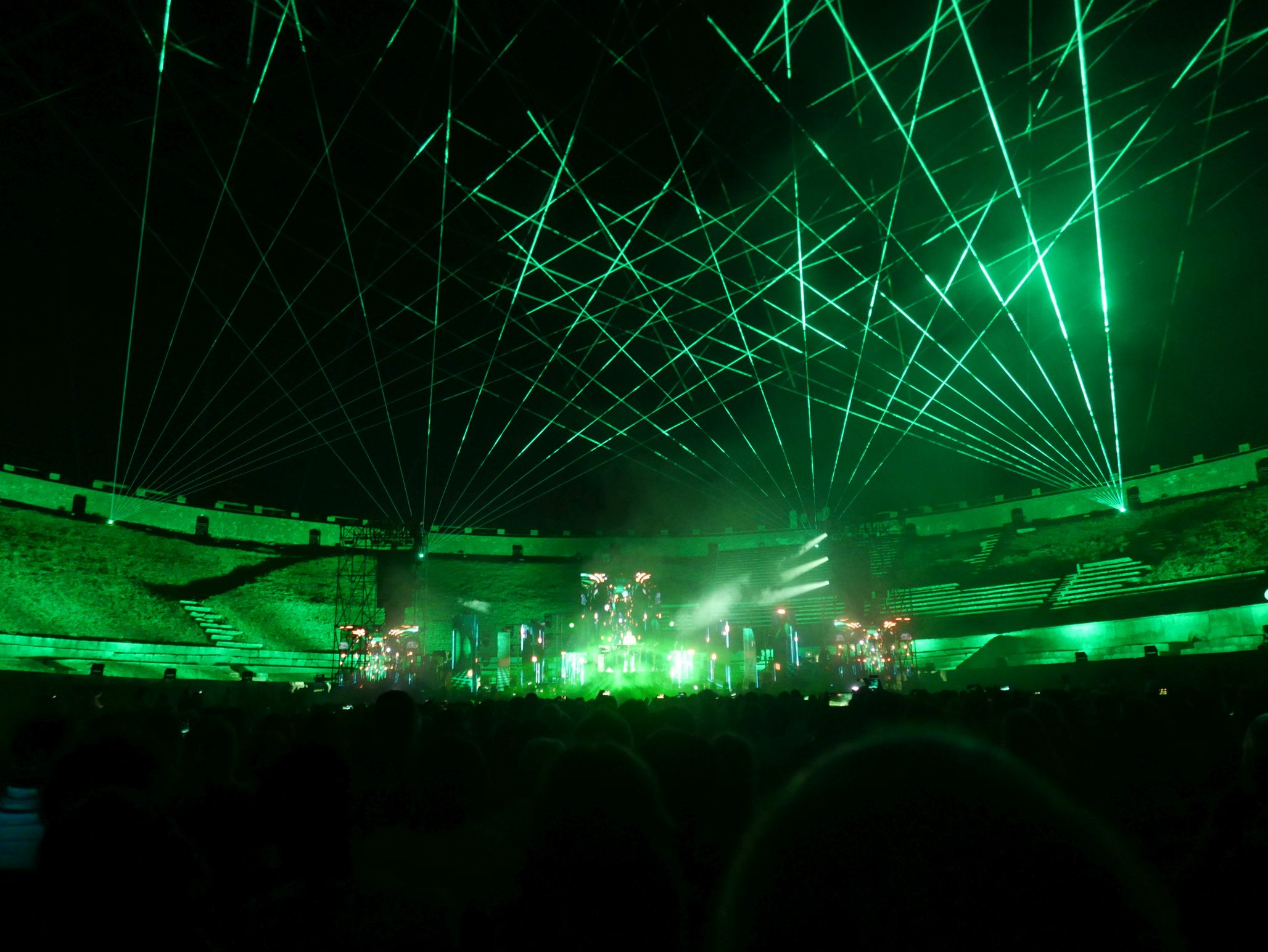 Der Innenraum des Amphitheaters war für das Konzert komplett bestuhlt, auf den unteren Rängen im Rund des Amphitheaters saßen auch noch einige Besucher. Das Ganze wirkte fast intim, bei knapp 2000 Zuschauern. Da die Bühne kein Dach hatte, an dem Scheinwerfer aufgehängt waren, wurde ein Teil der Licht- und Lasershow rund um das Oval des Theaters verteilt, was das Publikum im wahrsten Sinne des Wortes in die Show "eintauchen" ließ. Ein wirklich tolles Erlebnis!
