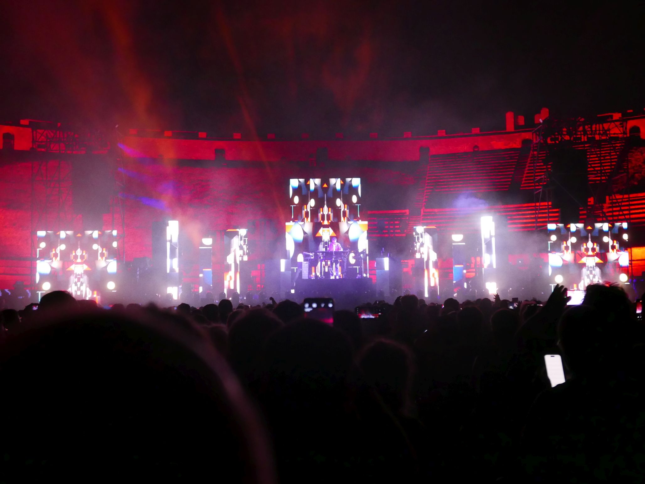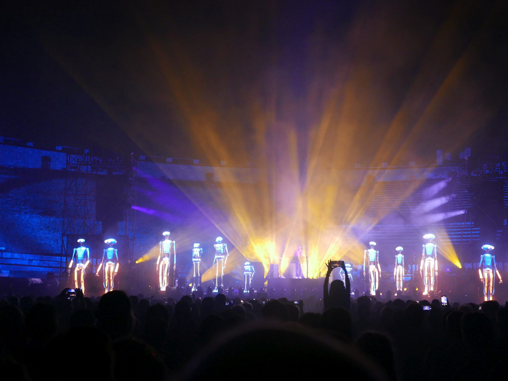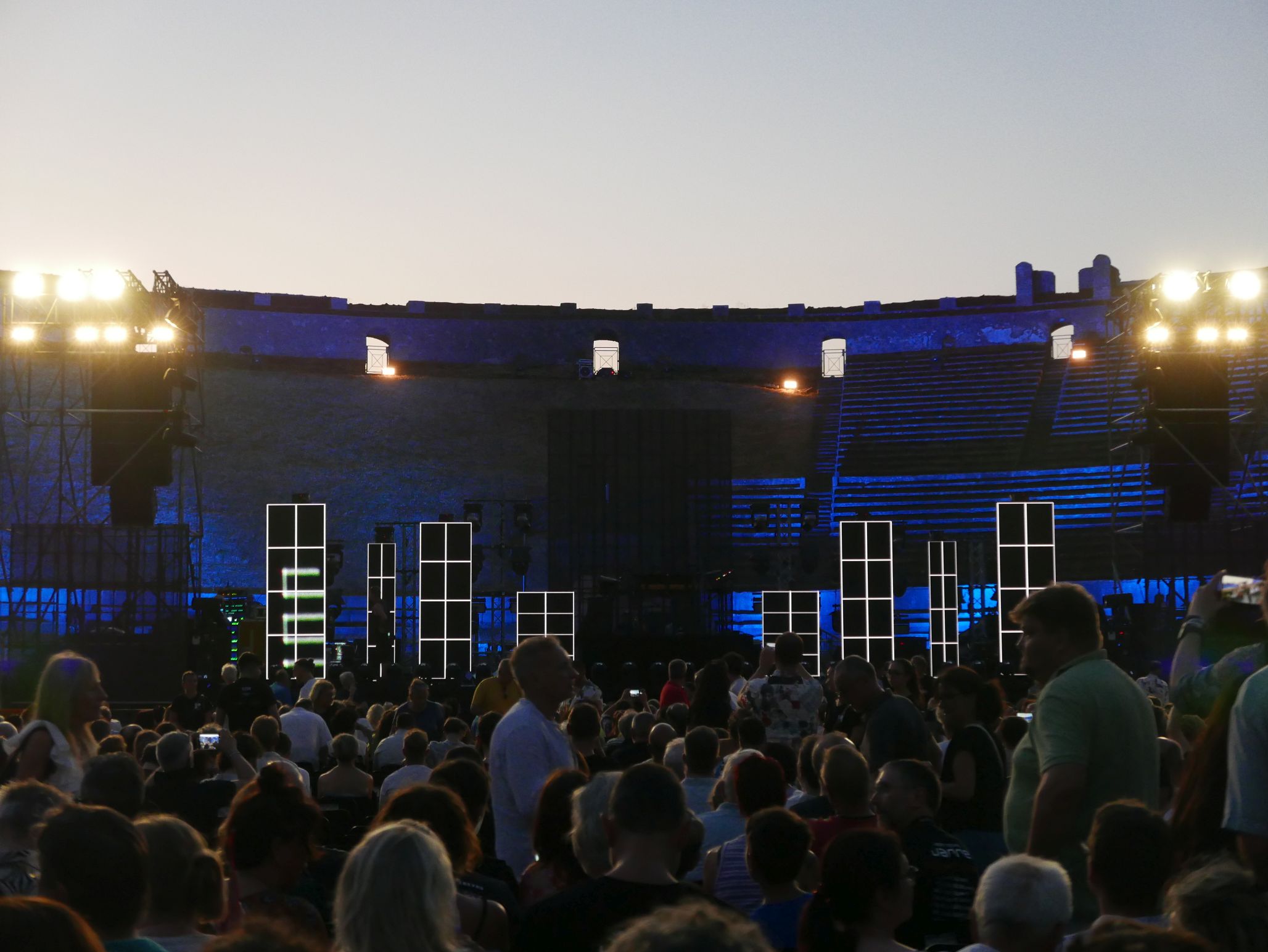 Der Innenraum des Amphitheaters war für das Konzert komplett bestuhlt, auf den unteren Rängen im Rund des Amphitheaters saßen auch noch einige Besucher. Das Ganze wirkte fast intim, bei knapp 2000 Zuschauern. Da die Bühne kein Dach hatte, an dem Scheinwerfer aufgehängt waren, wurde ein Teil der Licht- und Lasershow rund um das Oval des Theaters verteilt, was das Publikum im wahrsten Sinne des Wortes in die Show "eintauchen" ließ. Ein wirklich tolles Erlebnis!