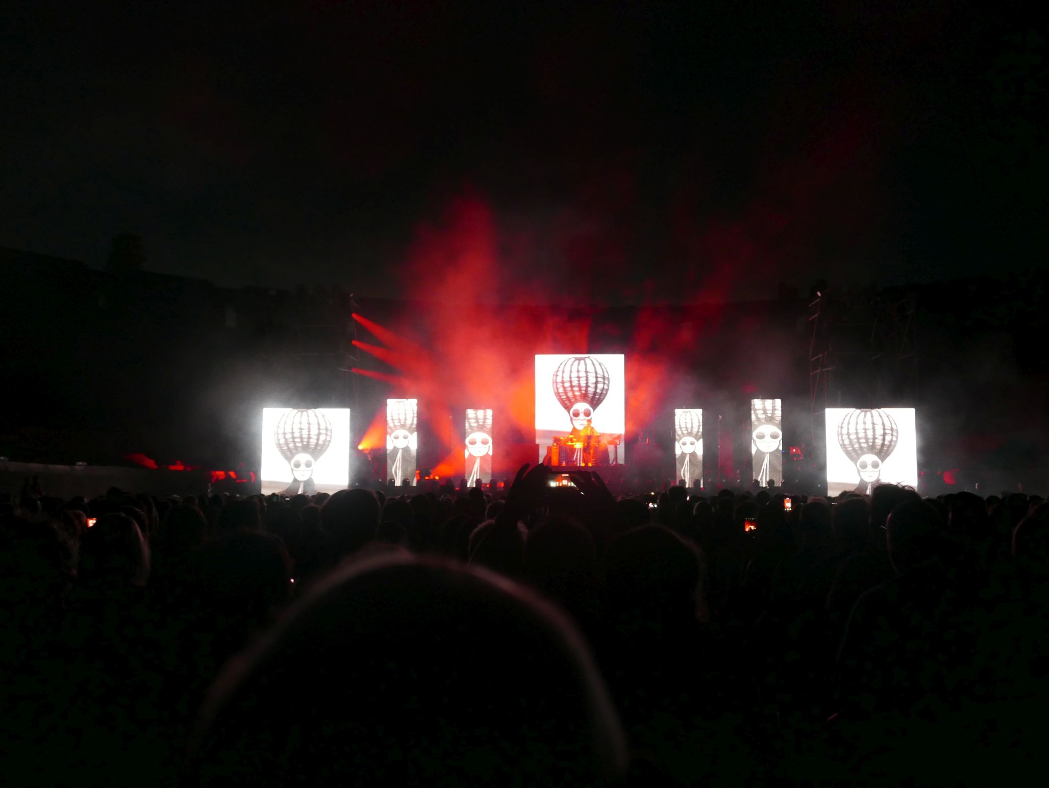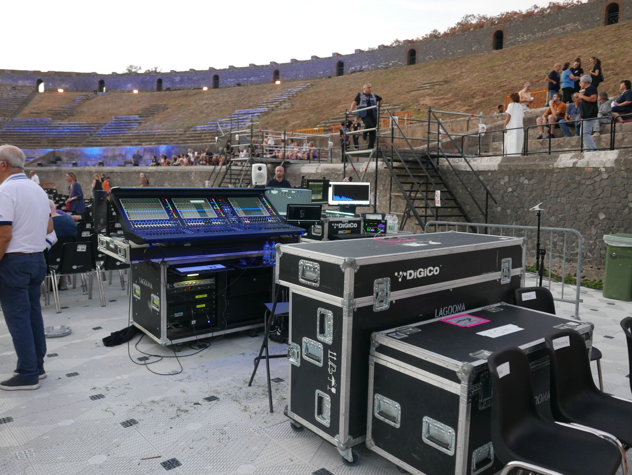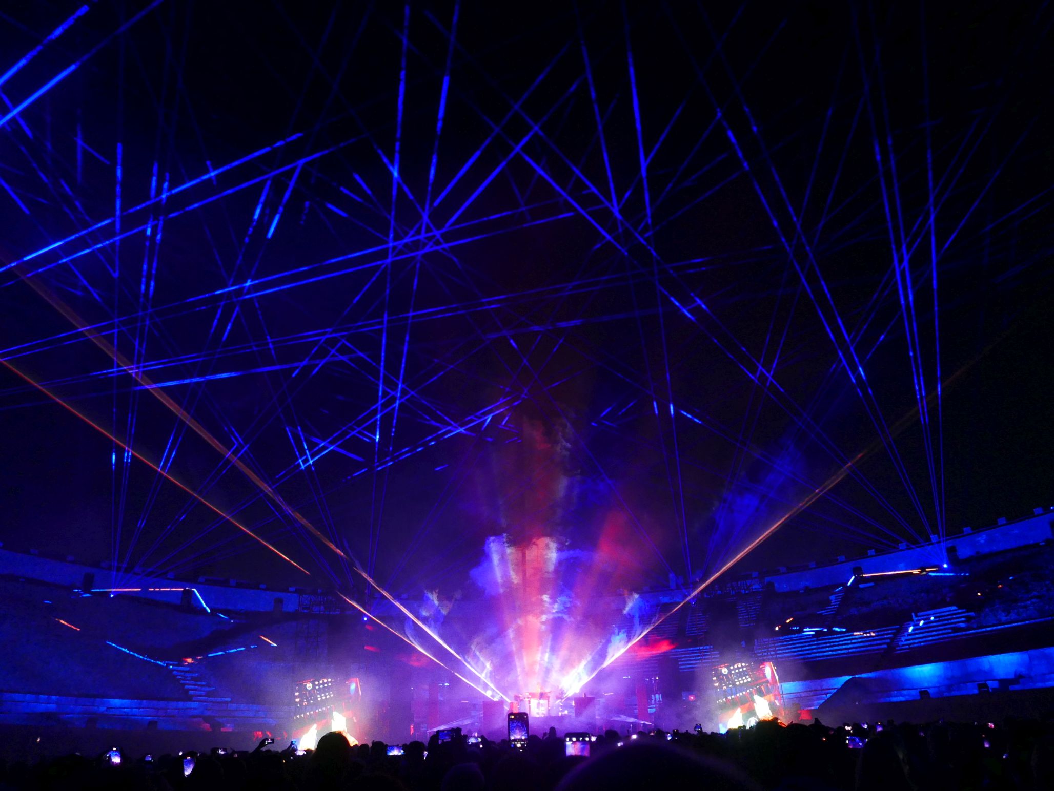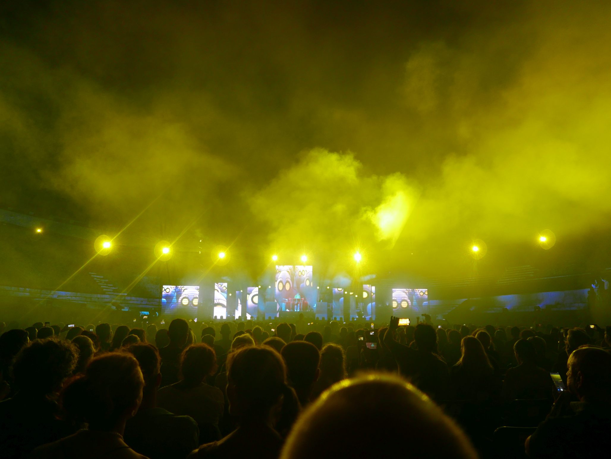 Der Innenraum des Amphitheaters war für das Konzert komplett bestuhlt, auf den unteren Rängen im Rund des Amphitheaters saßen auch noch einige Besucher. Das Ganze wirkte fast intim, bei knapp 2000 Zuschauern. Da die Bühne kein Dach hatte, an dem Scheinwerfer aufgehängt waren, wurde ein Teil der Licht- und Lasershow rund um das Oval des Theaters verteilt, was das Publikum im wahrsten Sinne des Wortes in die Show "eintauchen" ließ. Ein wirklich tolles Erlebnis!