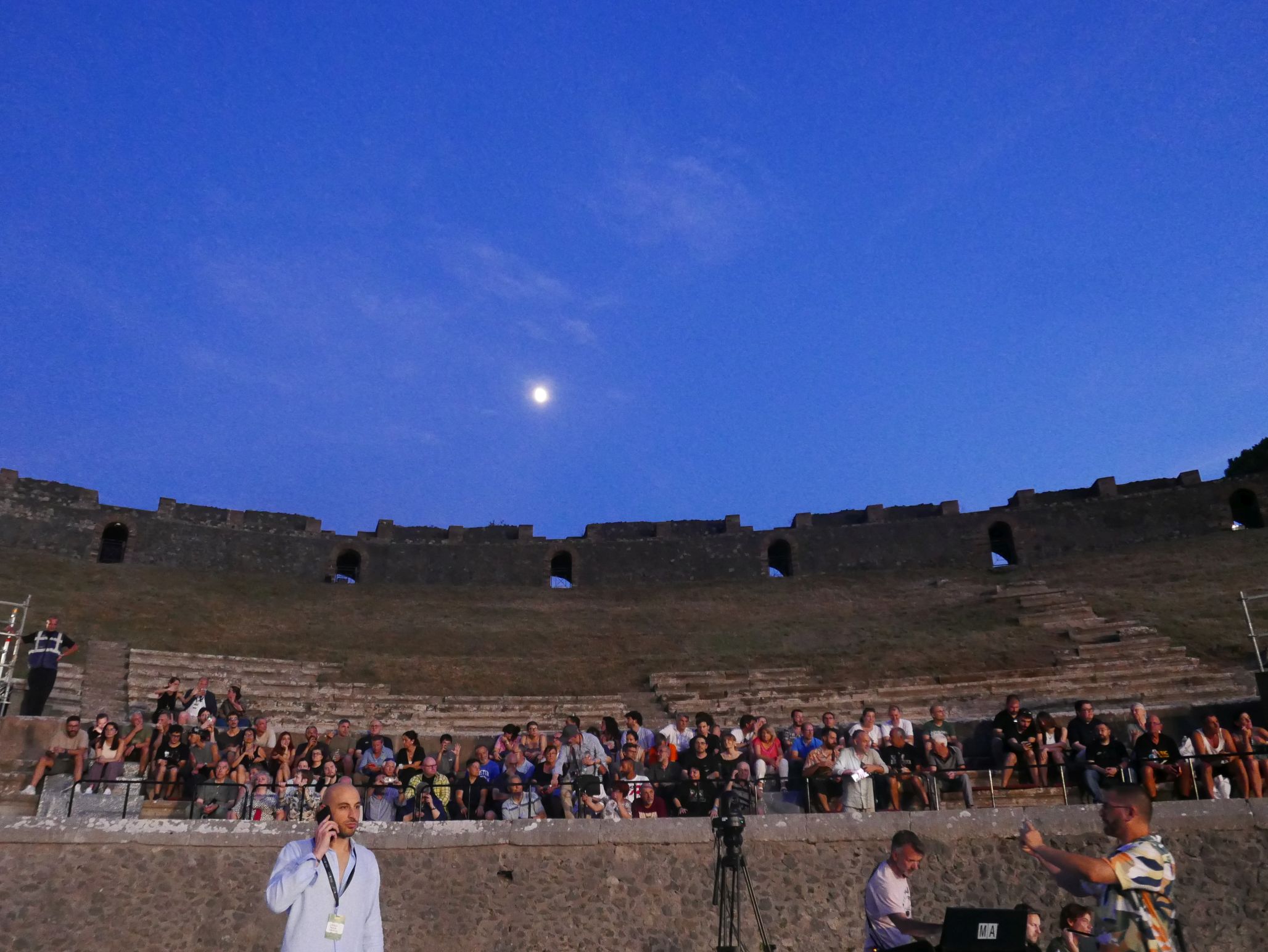 Heute vor einem Monat gab Jean-Michel ein Konzert im Amphitheater von Pompeji. Das reizvolle Angebot dort aufzutreten, trug letztlich dazu bei, dass die Fans 2025 in den Genuss einer Sommer-Tour kamen, die so eigentlich gar nicht geplant war. Es war ein ganz besonderer Schauplatz, auch wenn man (wegen der Außenmauern des Amphitheaters) von den Sitzplätzen im Innenraum aus den Vesuv nicht sehen konnte, der im Jahr 79 n. Chr. bei einem Ausbruch die damalige Stadt Pompeji verschüttete, zugleich aber auch konservierte. Ein Besuch der Ausgrabungsstätte ist auf jeden Fall lohnenswert, am besten mit einer geführten Tour, da einem sonst viele Dinge entgehen.