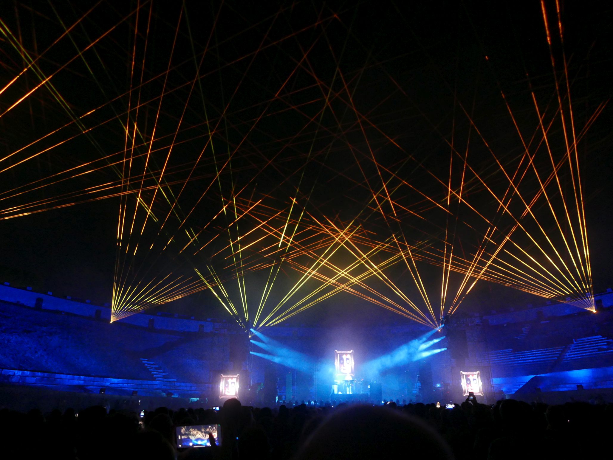 Der Innenraum des Amphitheaters war für das Konzert komplett bestuhlt, auf den unteren Rängen im Rund des Amphitheaters saßen auch noch einige Besucher. Das Ganze wirkte fast intim, bei knapp 2000 Zuschauern. Da die Bühne kein Dach hatte, an dem Scheinwerfer aufgehängt waren, wurde ein Teil der Licht- und Lasershow rund um das Oval des Theaters verteilt, was das Publikum im wahrsten Sinne des Wortes in die Show "eintauchen" ließ. Ein wirklich tolles Erlebnis!
