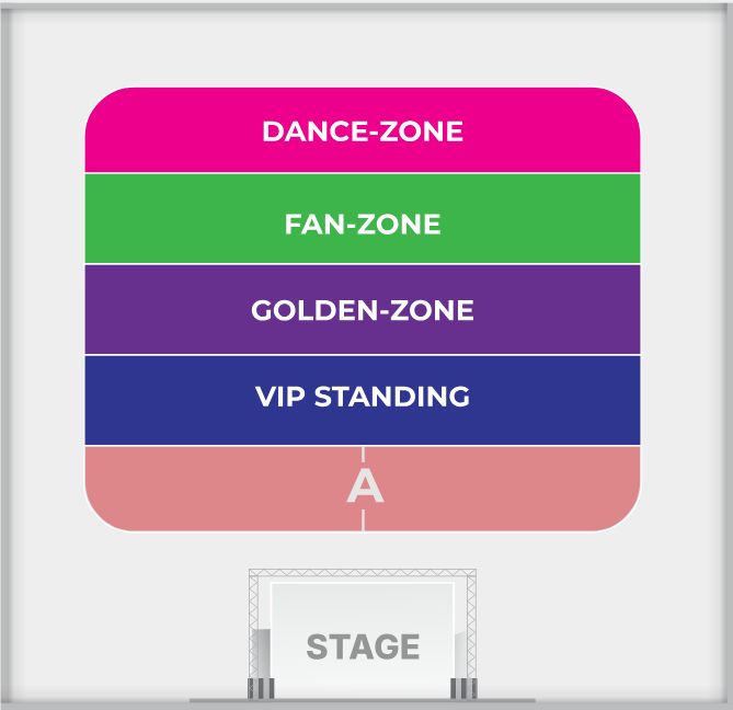 Der Zuschauerbereich des Konzerts ist dabei in unterschiedliche Zonen aufgeteilt. Von hinten nach vorne gibt es die "Dance Zone" (Tickets: 500.000 UZS), die "Fan-Zone" (Tickets: 800.000 UZS), die "Golden Zone" (1.500.000 UZS) und schließlich der Bereich "VIP Standing" (für 2.000.000 UZS). Davor ist noch ein roter Bereich eingezeichnet, der mit dem Buchstaben "A" gekennzeichnet ist, vermutlich für Ehrengäste.