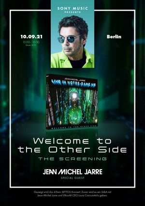 Anlässlich der Veröffentlichung der BluRay/CD und Vinyl-Ausgabe von "Welcome To The Other Side" kommt Jean-Michel am Veröffentlichungstag, dem 10. September nach Berlin. Dort wird er bei einem exklusiven Medien- und Fan-Screening anwesend sein. Vor dem Screening wird es ein Interview mit Jean-Michel und Louis Cacciuttolo (dem CEO der Firma VRrOOm, die das virtuelle Konzert produzierte) geben. Beginn ist um 15 Uhr, Dauer ca. eine Stunde.