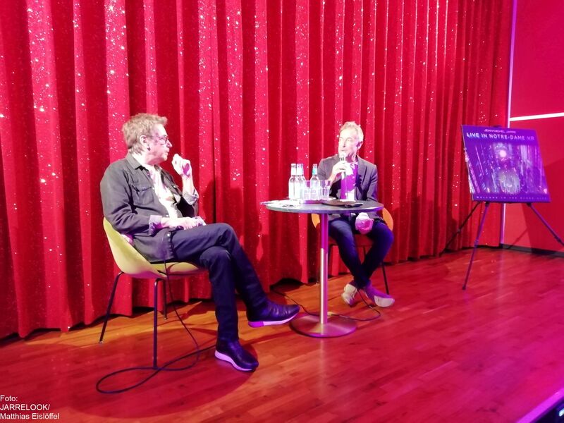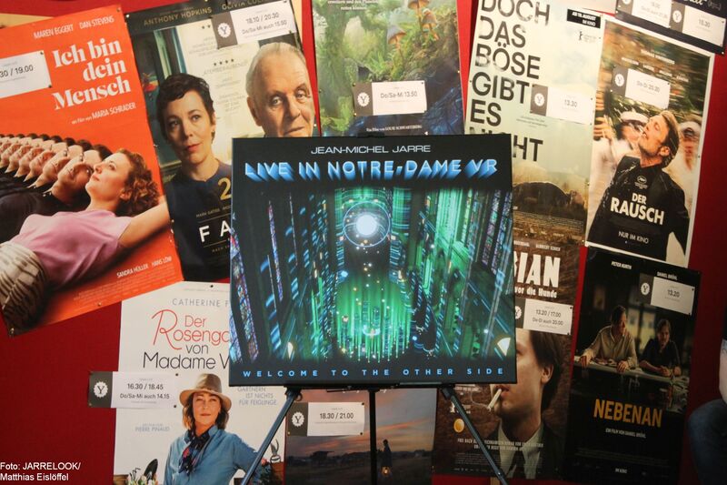In der Einganghalle stand das Coverbild des neuen Albums auf eine Leinwand gezogen und aus den Lautsprechern klang zur Einstimmung schon etwas Jarre-Musik. Eine weitere Leinwand mit dem Album-Motiv stand auf der Bühne des überraschend kleinen Kinosaales.